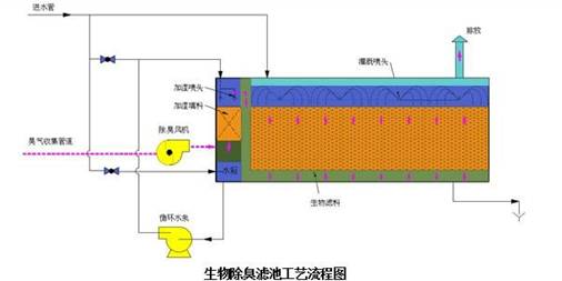 惡臭氣體經過管道收集后進入預處理裝置,經水洗加濕使廢氣的濕度增加,濕氣體再進入生物過濾除臭裝置,氣流與循環液在穿過生物填料層的過程中完成生物的氣液擴散、液固擴散、生物氧化三個過程,生物填料表面生物膜中的微生物以惡臭氣體物質為營養,惡臭物及VOCs被微生物氧化分解,在轉化過程中產生能量,為微生物的生長與繁殖提供能源,使惡臭氣體物質的轉化持續進行,經凈化后的氣體由引風機引出排放。