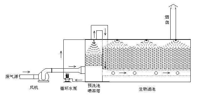 惡臭氣體收集裝置→預處理裝置→生物過濾裝置→抽風機→達標排放
