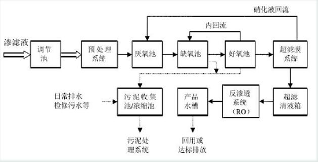 通過以上對垃圾滲濾液的各污染物分析及其水質水量受當地氣候和垃圾填埋場“年齡”的影響,對處理方法一一進行說明和比較,結合生活垃圾滲濾液的具體情況以及污水處理的目的、投資、占地面積、能耗、運行費用、管理方面程度、運行可靠性及使用壽命等綜合因素的分析,以及我公司根據大量前期調研結果、吸收國內外滲濾液處理的經驗并結合多年廢水治理的實踐經驗,在進行充分、合理分析污水處理系統運行過程中將會出現的水質沖擊負荷及當地的具體氣候等情況后,特采用以下工藝: