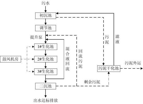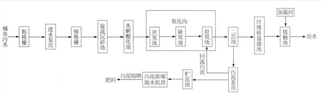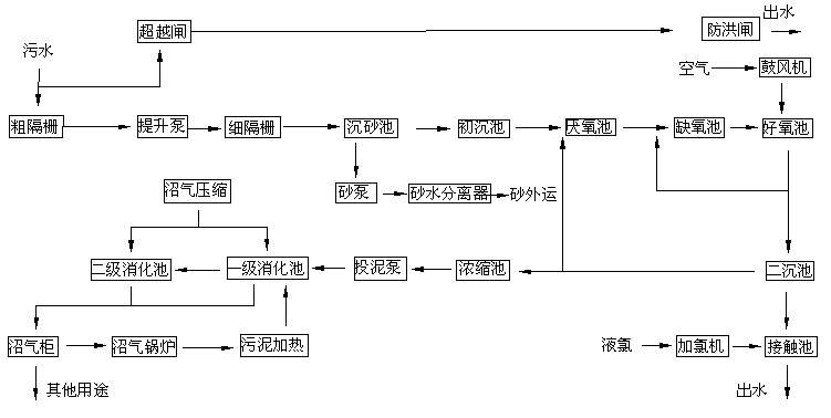 進水→沉淀池→厭氧消化池→厭氧生物濾池→拔風管→氧化溝→進氣出水井→排水。