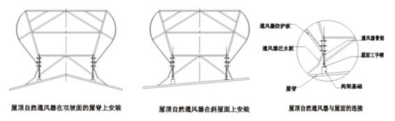 屋頂通風(fēng)器安裝在用戶提供的基礎(chǔ)構(gòu)架上,構(gòu)架面應(yīng)做成水平。可以單排布置,也可雙排布置,可布置在雙坡屋面的屋脊處,也可布置在斜屋面上。屋頂通風(fēng)器安裝完畢后,應(yīng)作防水處理。