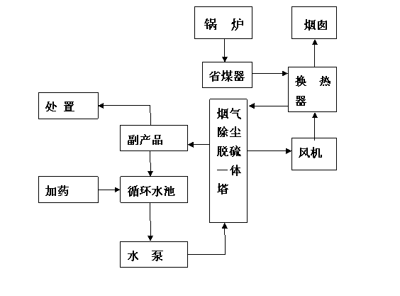 本方案設計流程:煙氣→余熱回收裝置(省煤器)→換熱器→脫硫除塵一體塔→換熱器→排放。(本流程僅供參考,我公司根據不同情況設計不同方案,但均以處理達標、投資小、占地面積小、管理方便為宗旨)