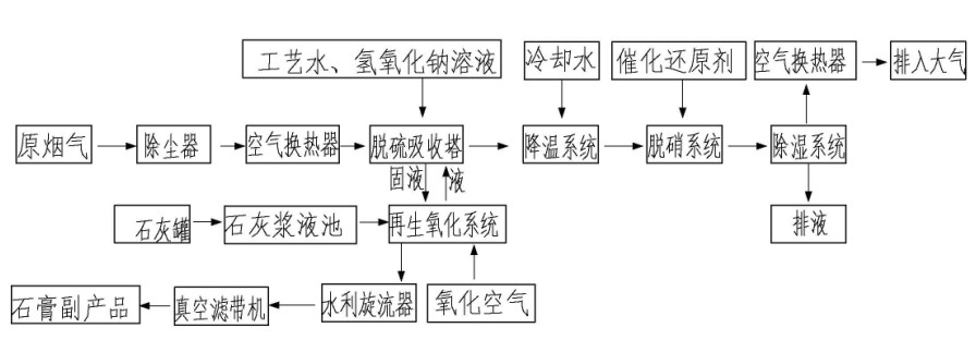 雙堿法脫硫+濕法催化脫硝工藝,整套系統由以下子系統組成: