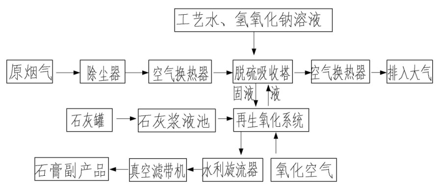 雙堿法是采用鈉基脫硫劑進行塔內(nèi)脫硫,由于鈉基脫硫劑堿性強,吸收二氧化硫后反應產(chǎn)物溶解度大,不會造成過飽和結(jié)晶,造成結(jié)垢堵塞問題。另一方面脫硫產(chǎn)物被排入再生池內(nèi)用氫氧化鈣進行還原再生,再生出的鈉基脫硫劑再被打回脫硫塔循環(huán)使用,雙堿法脫硫工藝大大降低了投資及運行費用。